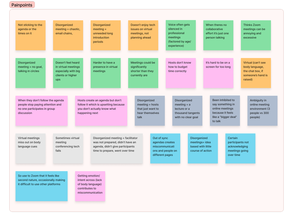 Analyzing each participant's pain points post-interview helped me identify three main issues that tend to arise when dealing with productivity meetings.