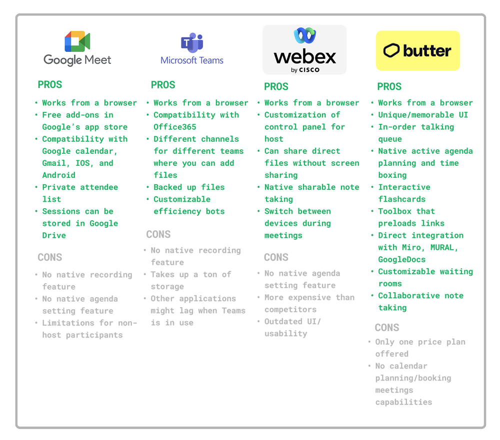 Most of the competitor video conferencing platforms were relatively standard. I saw huge opportunities in a newer player in the space, Butter. Butter felt fresh, experimental, and utilized a ton of additional native features to make the online meeting experience more engaging.