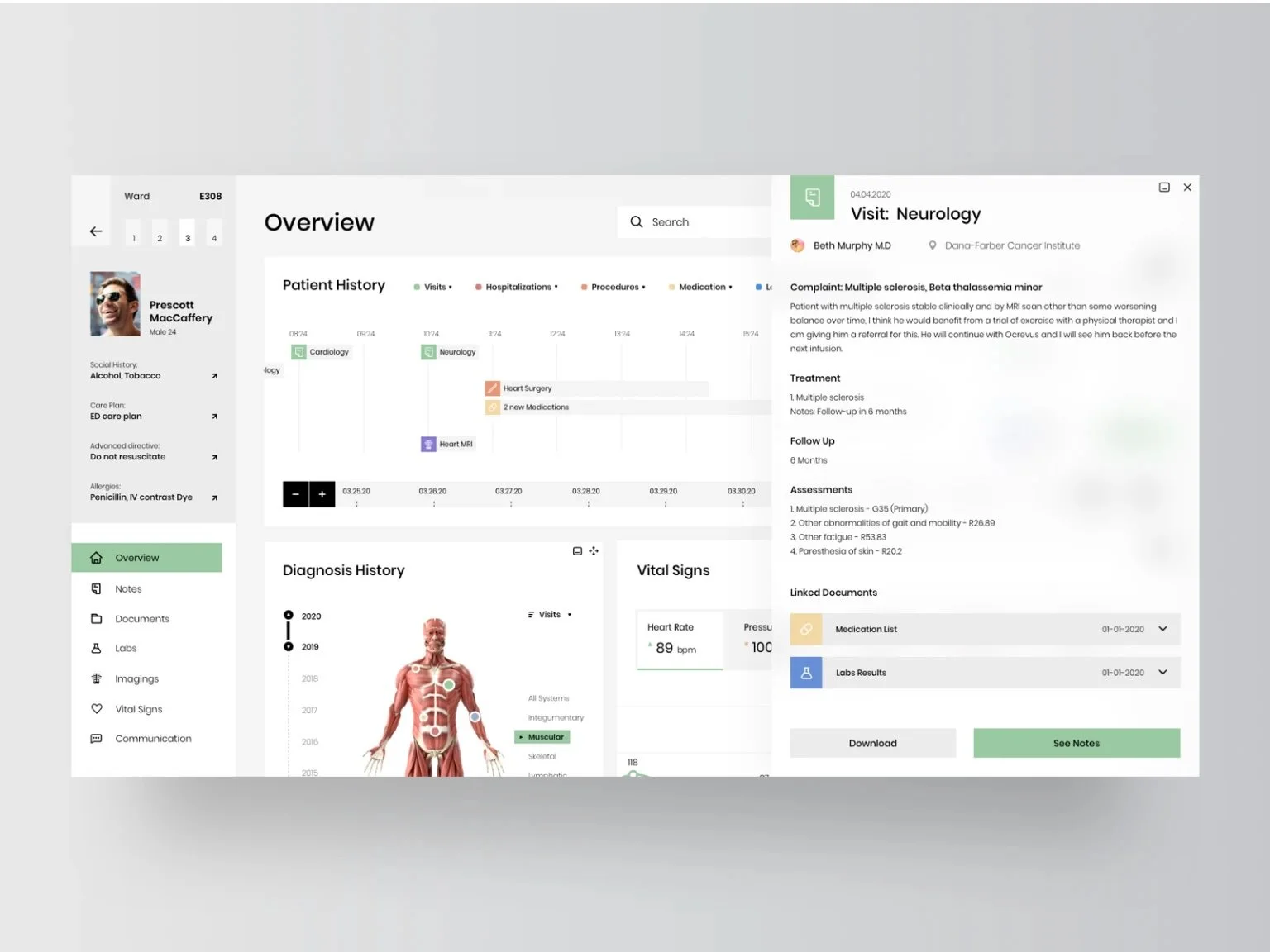 We came up with a timeline of the history of the patient, his or her visits, operations, medication prescriptions, and other medical indicators to quickly so that doctors can quickly familiarize with the entire history of the disease or restore any time slot by the minute.